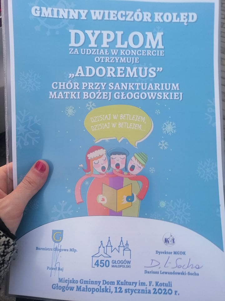 W dniu 12 stycznia 2020 r. nasz Chór Parafialny „Adoremus” wystąpił w Gminnym Wieczorze Kolęd. Wydarzenie miało miejsce w Miejsko-Gminnym Domu Kultury w Głogowie Małopolskim.