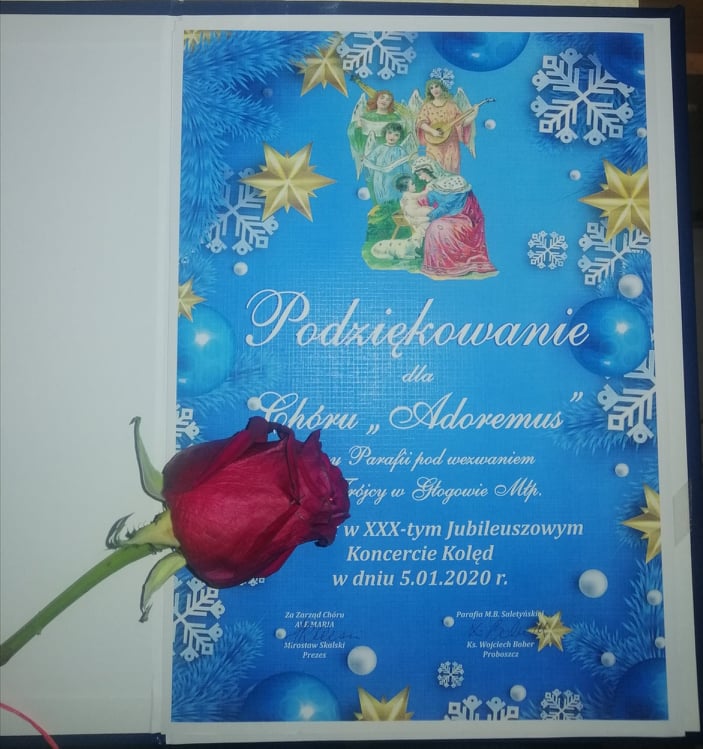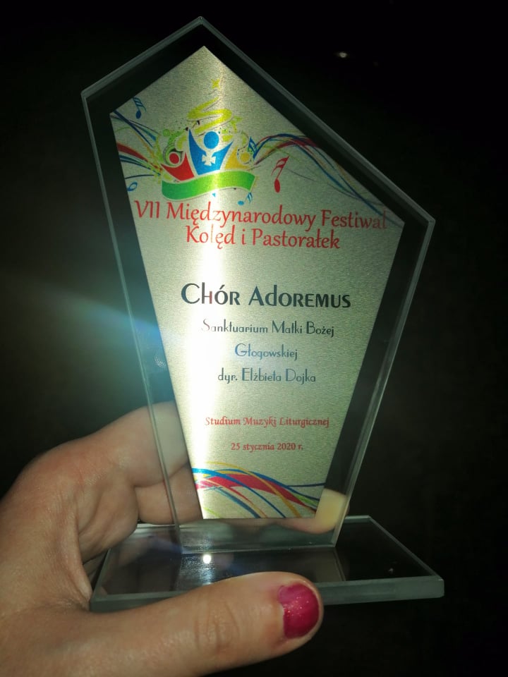 W sobotę 25 stycznia 2020 r. nasz Chór Parafialny „Adoremus” zaprezentował się podczas VII Międzynarodowego Festiwalu Kolęd i Pastorałek zorganizowanym u oo. Bernardynów w Sanktuarium Matki Bożej Rzeszowskiej. Nasz Chór otrzymał dyplom brązowy i pamiątkową statuetkę.